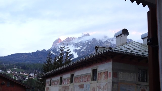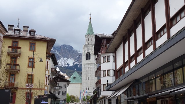 Last night we wandered back from the shops and took this photo of the main church in Cortina with a (partial) mountain backdrop. Unfortunately low clouds have ensured we do not see all.