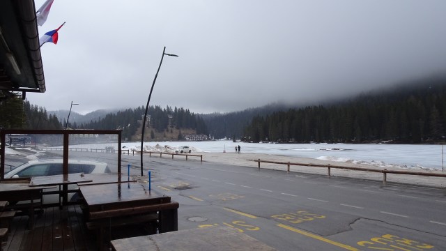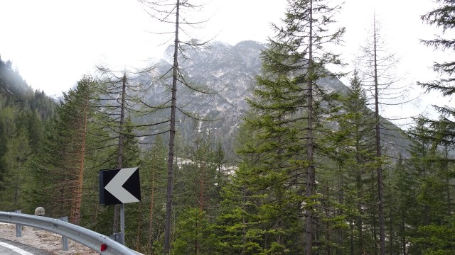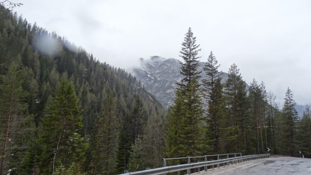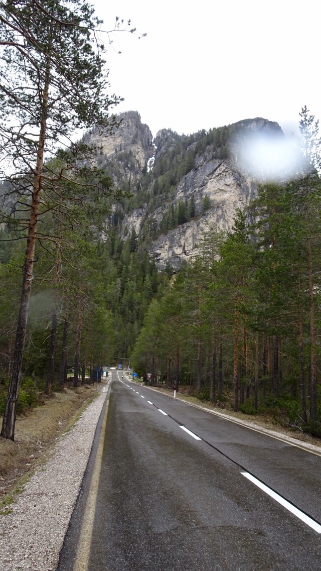 The road plateaus and descends before turning off to Misurina. You can see that the clouds are extremely low and you only get glimpses of the mountains occasionally.