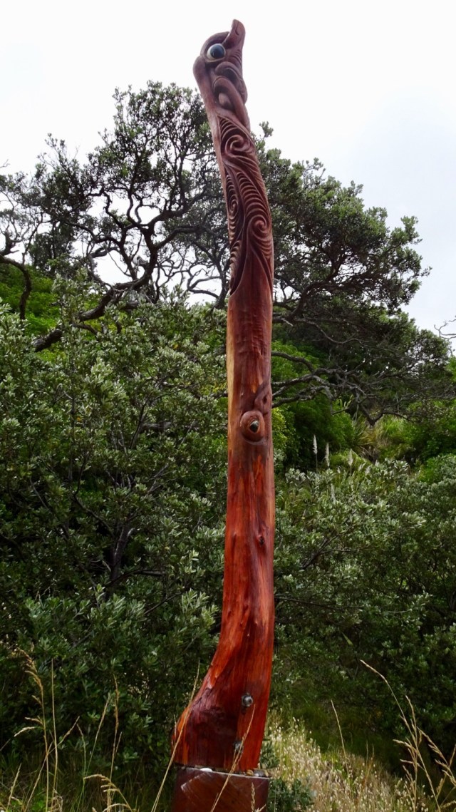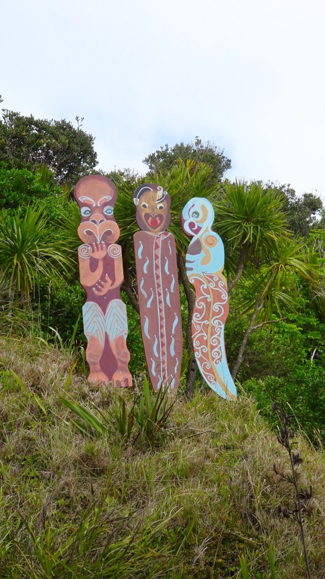 A walkway to another beach reveals these Maori totems.