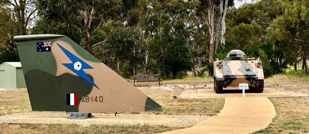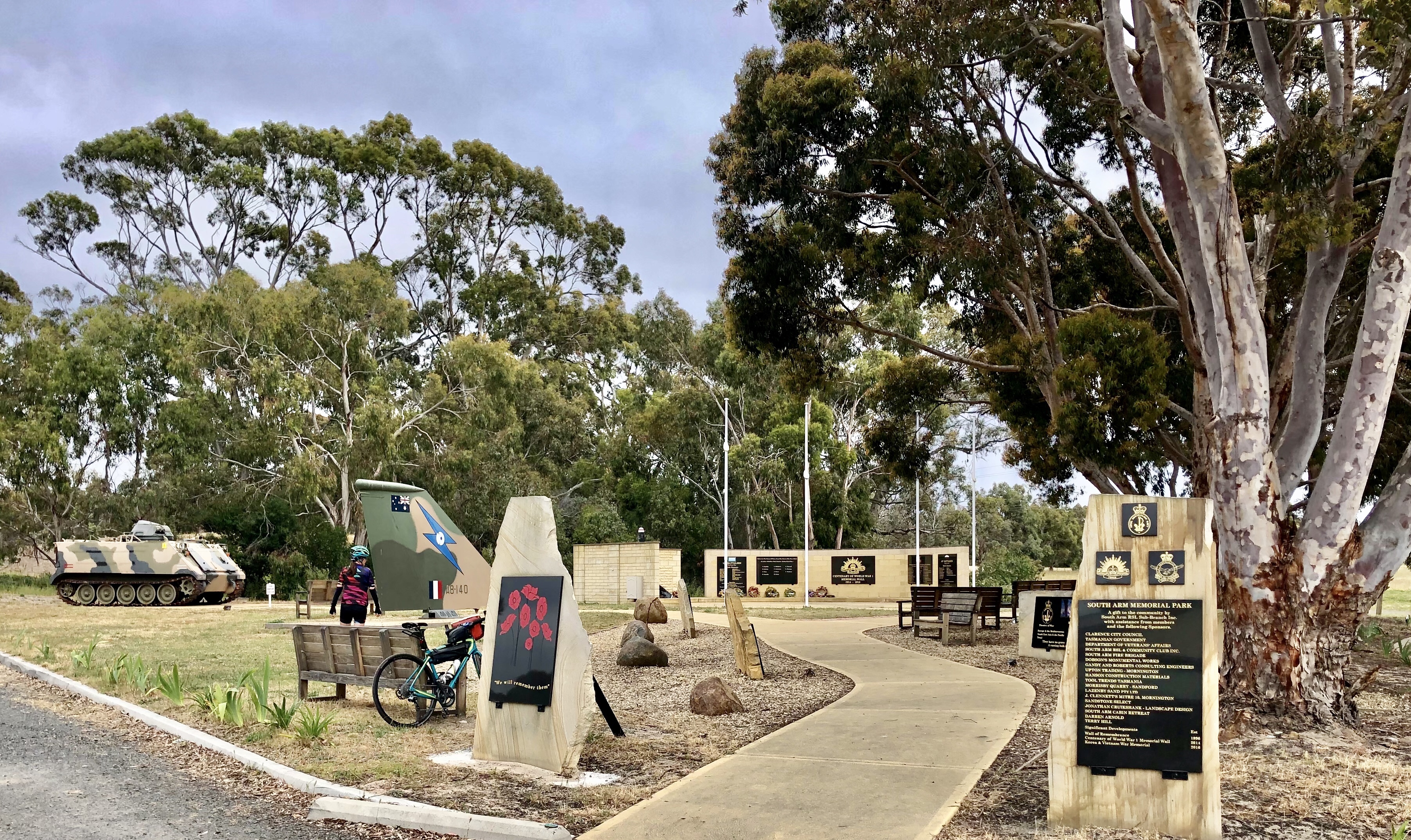 Next stop was the South Arm RSL and Iron Pot Golf Club. We turned in there as we could see an army tank. The South Arm war memorial is very interesting and well done with the tail fin of a F111 ( F one eleven), M113 armoured personnel carrier, and an image of HMAS Hobart, amongst the exhibits.