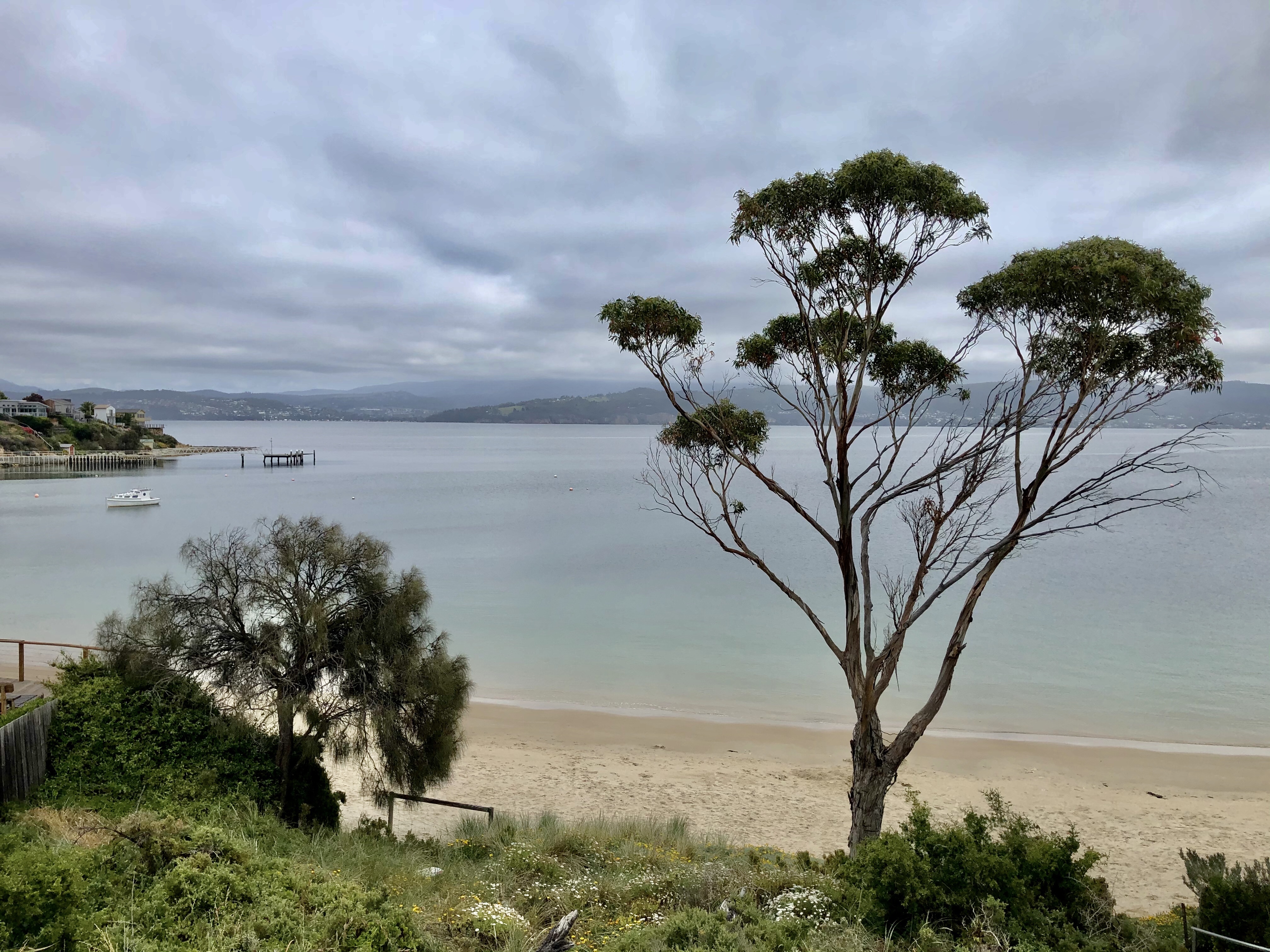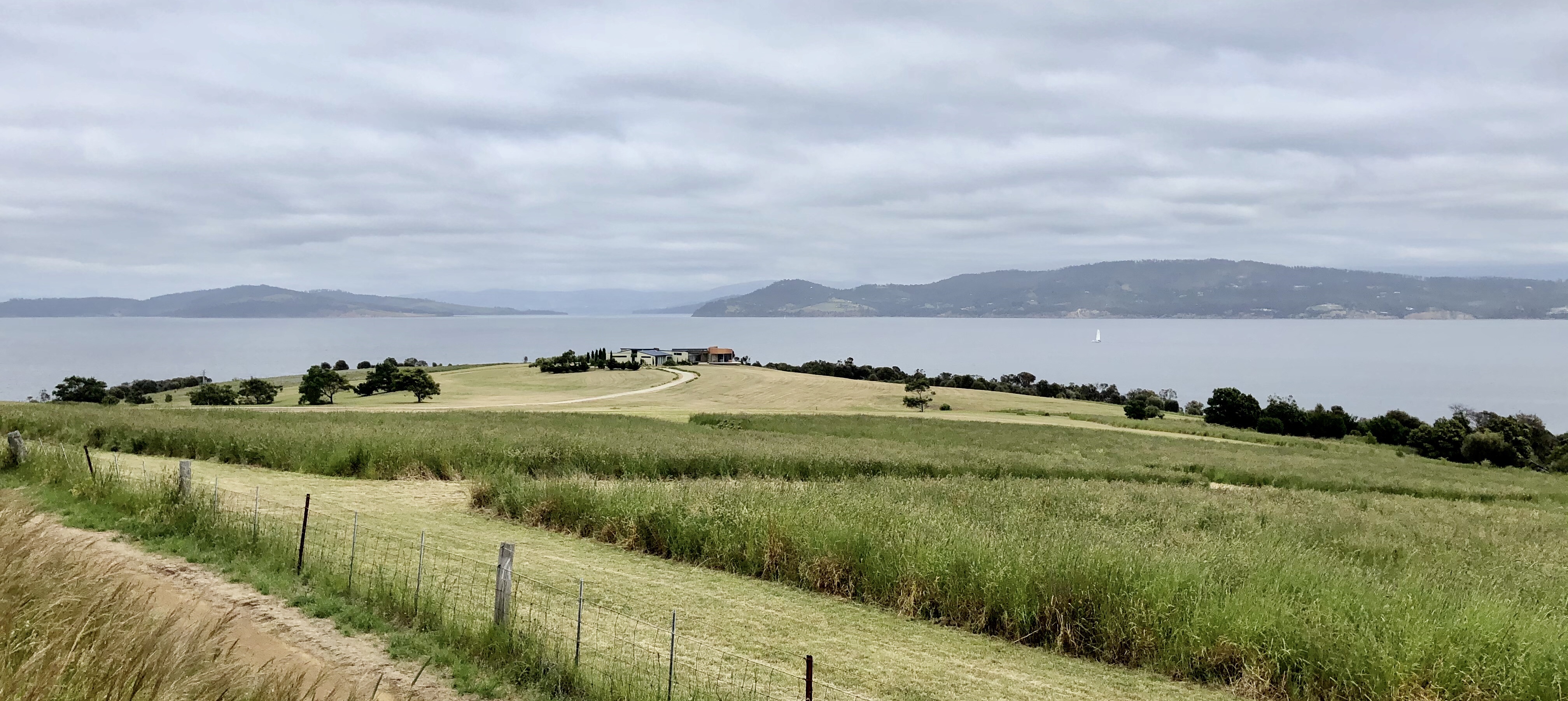 We headed on through the village of South Arm towards Opossum Bay stopping to admire this house and view. There has been some debate tonight about whether this is the house that Brian Ritchie, the bassist with the famous US folk punk band Violent Femmes owns. Apparently he is best mates with Tasmaniaβs leading IVF specialist who travels with the band. Further curiosity is that Brian also acts as a curator for MONA. Whoever owns this house, has a magnificent spot.