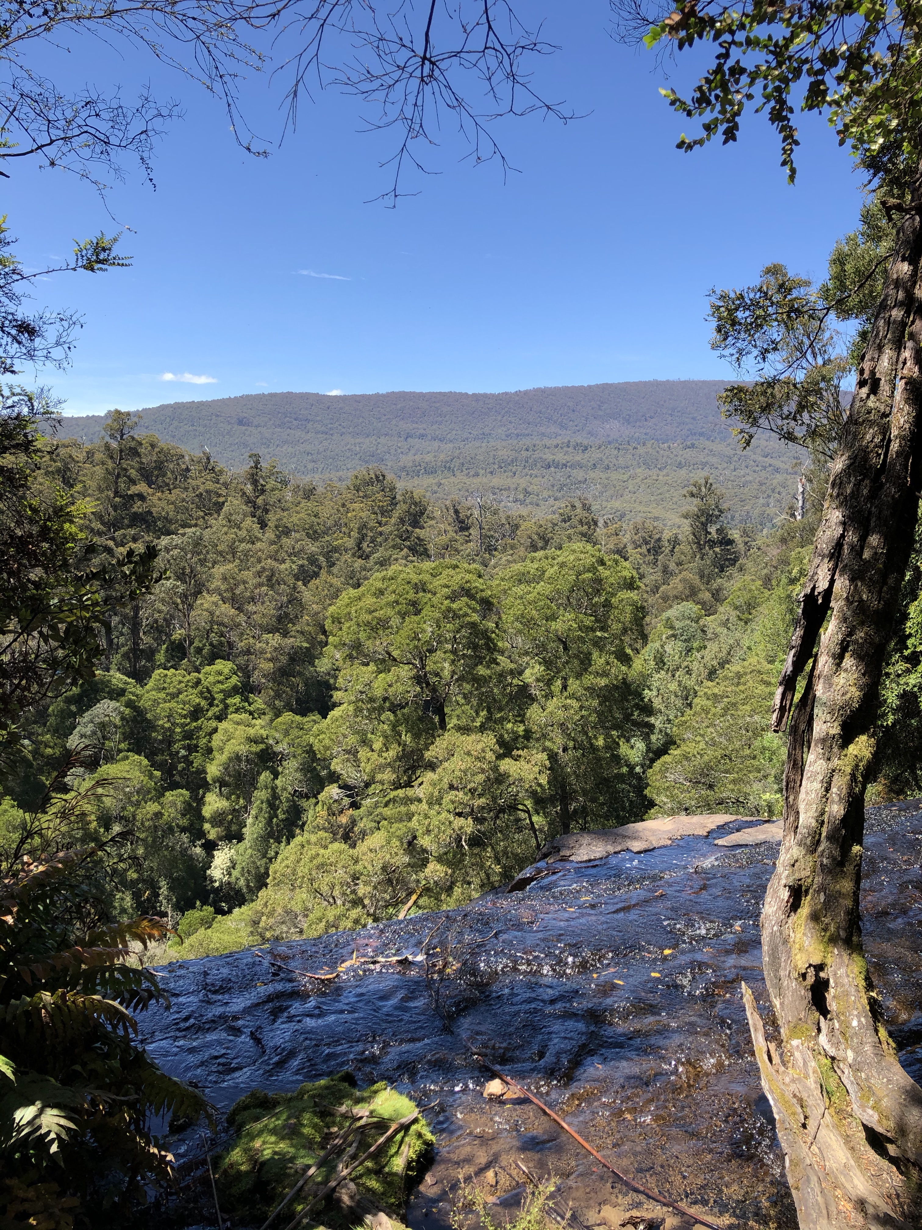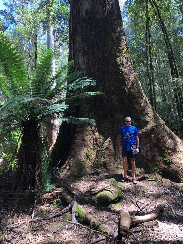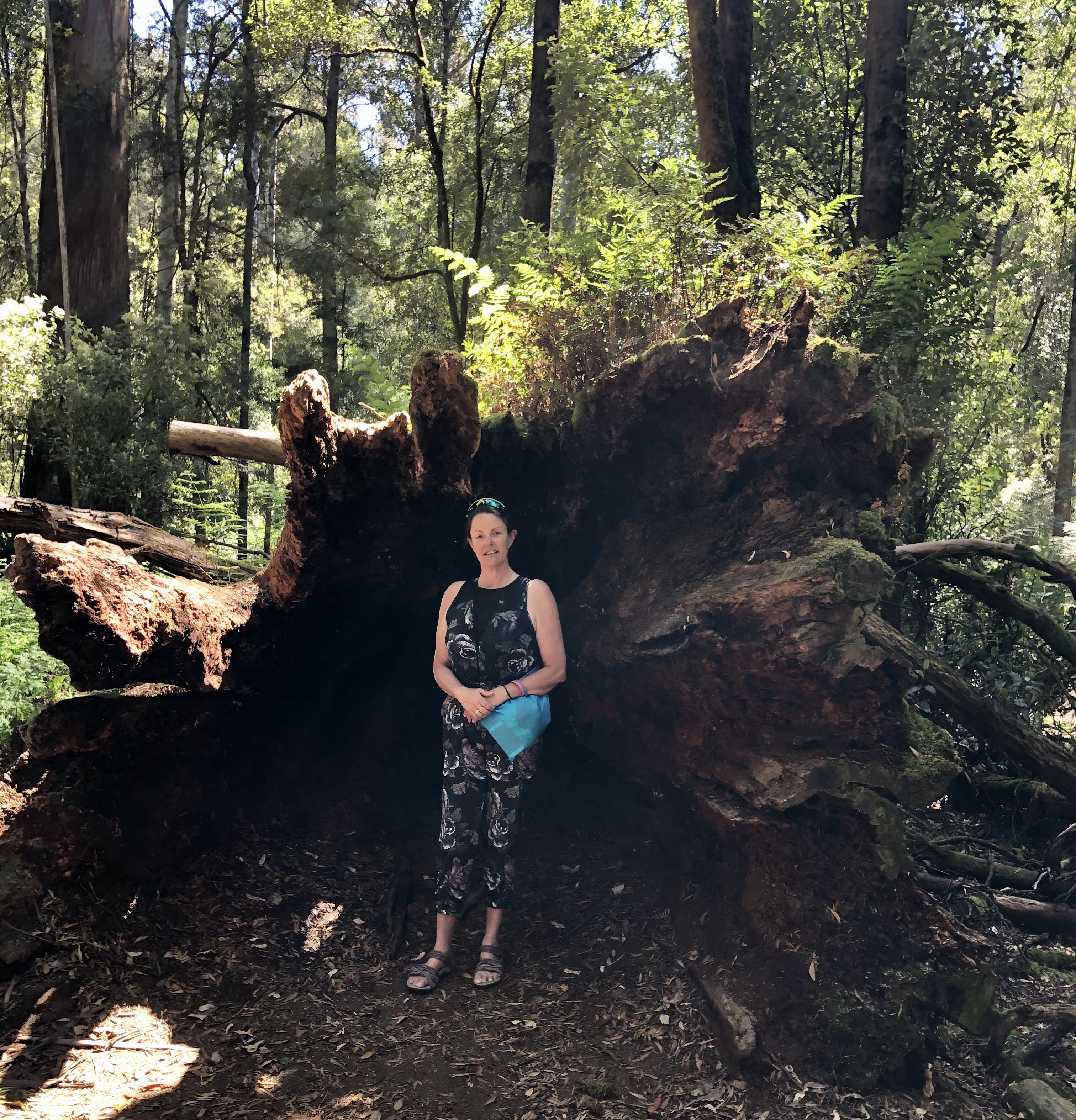 There are a variety of trees including eucalyptus, sassafras, myrtle and blackwood. Some of the fallen trees have massive bases.