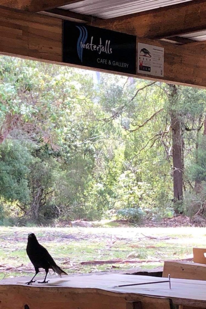 Time for an iced coffee and watching a cheeky bird cavorting in front of a sign telling us to keep the wildlife wild.