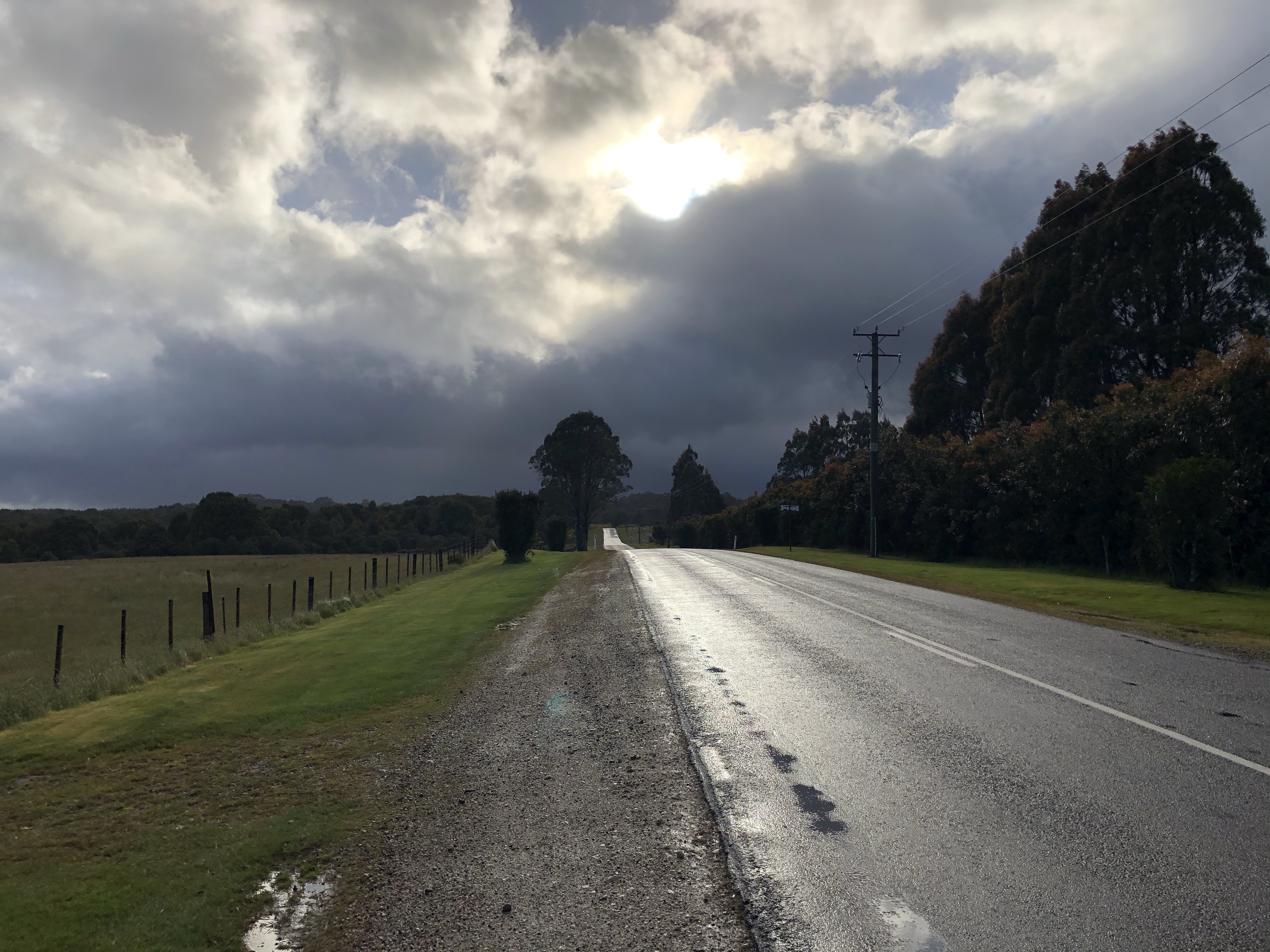 As we approached Hampshire the number of trucks increased as the plantation wood chip mill is there, with B double trucks filling up and taking their load to the Port of Burnie. The trucks were fast and close, and we did our best to ride in the verge.