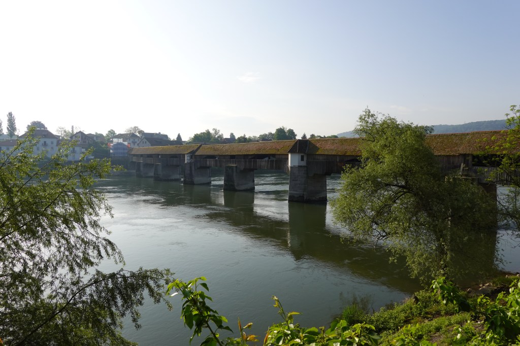 Riding back into Switzerland across the covered wooden bridge. The bridge is 203.7 metres in length and is the longest roofed wooden bridge in Europe. It was built in 1272 and has been destroyed several times. The current bridge was completed in 1700.