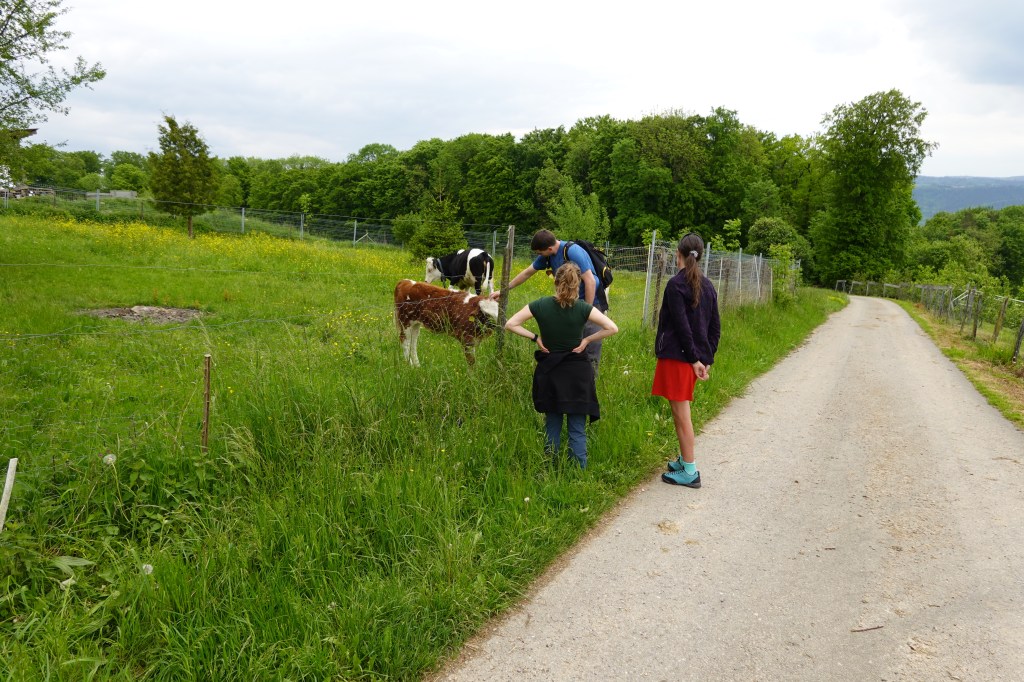 At the top of the climb, we walked around the edge of a farm with some curious cows.