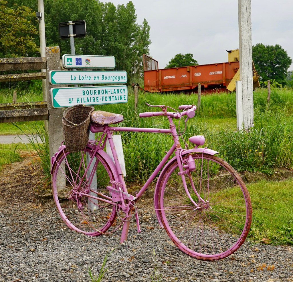 More pink bikes. The French are getting confused with the Giro. It is common to see pink cycling decorations in Italy as pink represents the Maglia Rosa, the jersey worn by the leader of the GC ( General Classification). In the Tour de France, the leaders jersey is the maillot jaune ( the yellow jersey).
