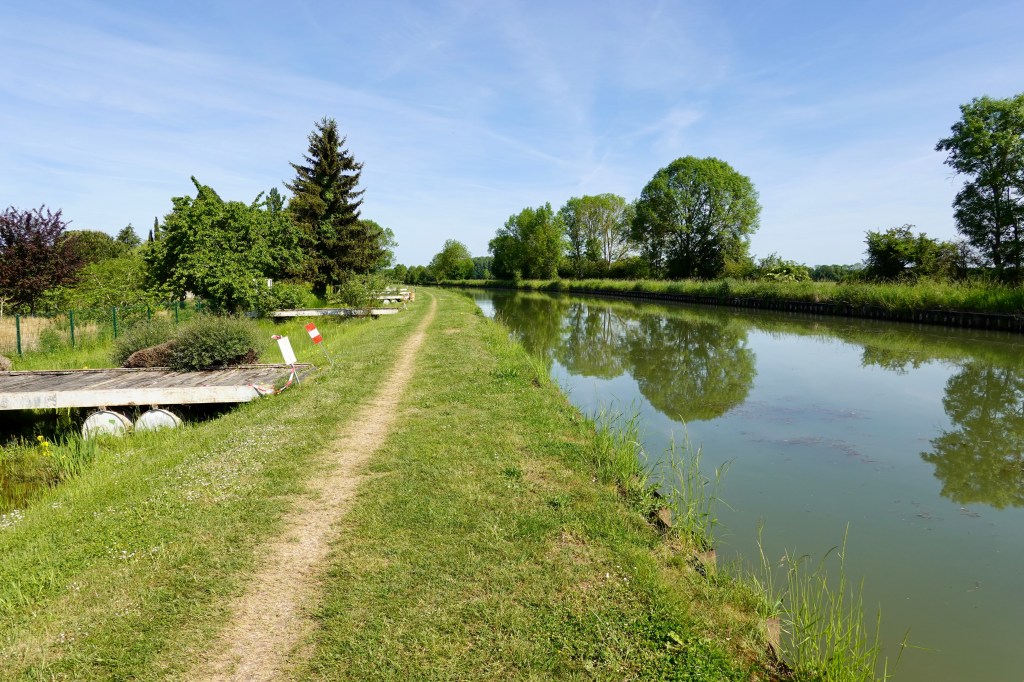 We soon hit a canal path and arrived in this little village. This church had a curious shape, square-ish at one end, rounded turrets at the other end.