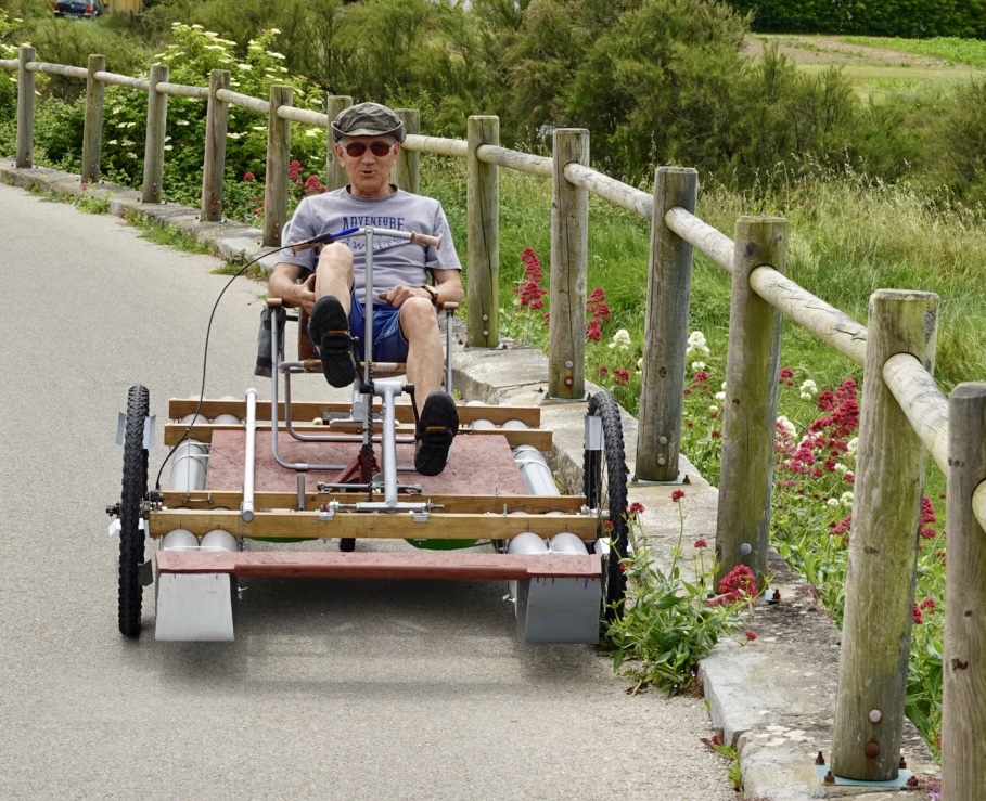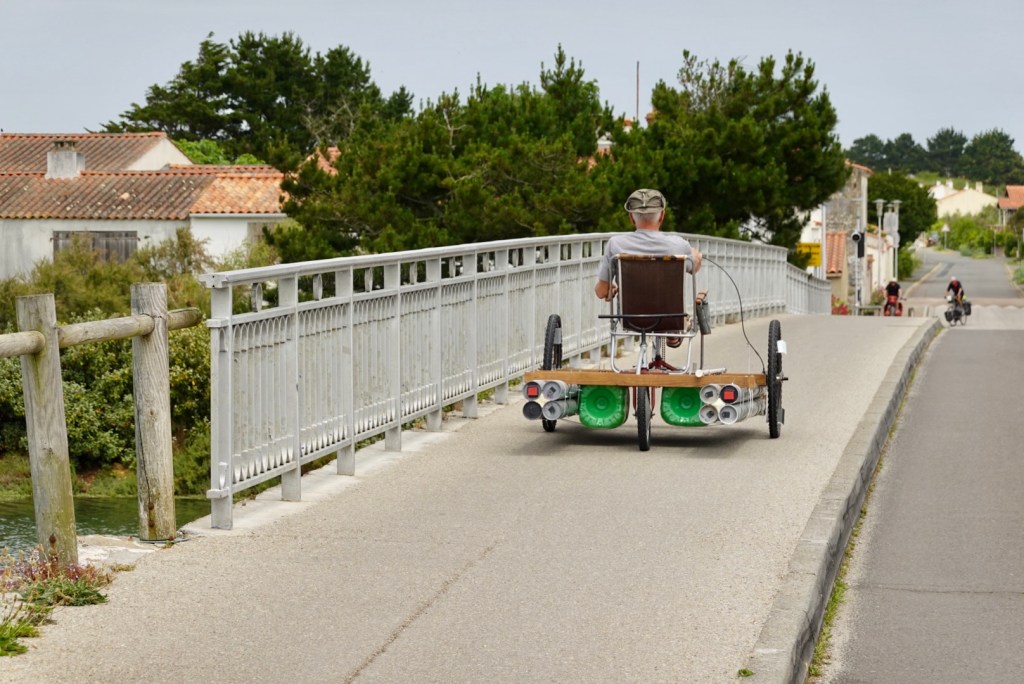 The guy stopped. He only spoke French but we understood he made this himself, and it floats. He pedals it in the water and goes fishing. Really interesting.