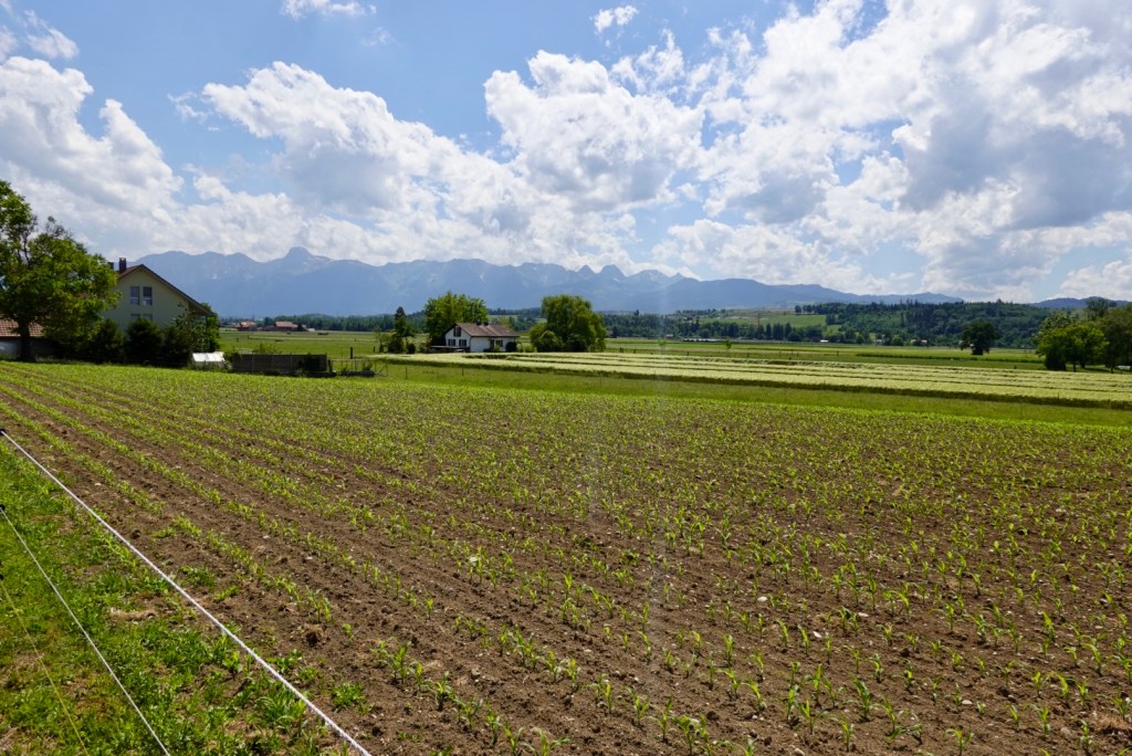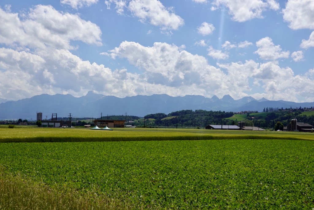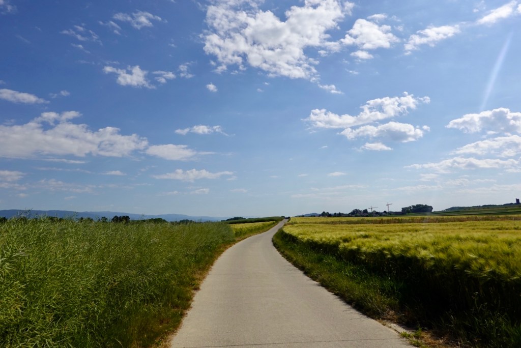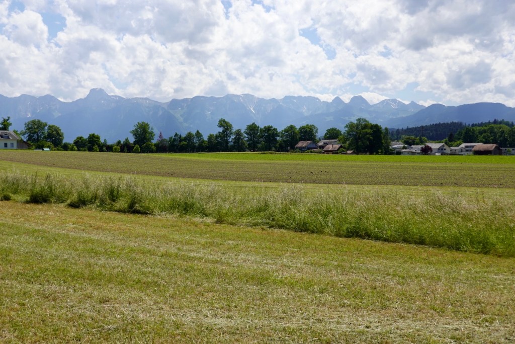 Once we cleared the city we could relax just a tad, but still on a busy arterial road until we joined the main bike trail. In the distance we have mountains again, part of the Berner Oberland range.