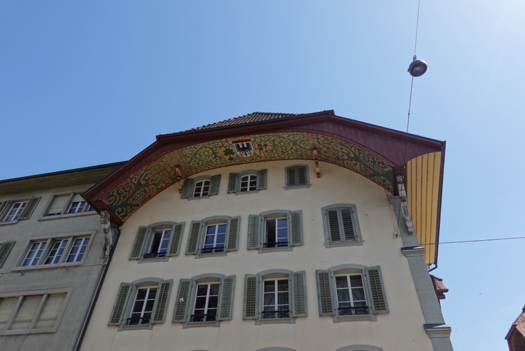 We planned to sit in Aarau for a while. The weather was lovely, and we had a fruit smoothie each after wandering around the town. Note the paintings under the eaves.