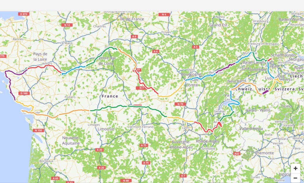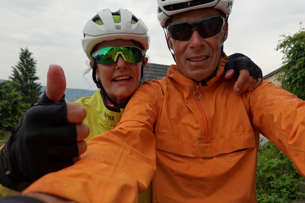 There was a bus shelter at the top of the climb that we sat in as it had just started to spit with rain. Checking the Swiss rain radar site, we could see the band moving towards Basel and knew we were likely to get more rain.
