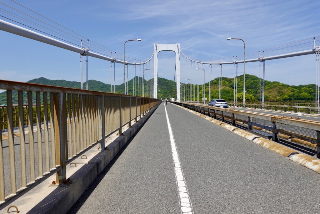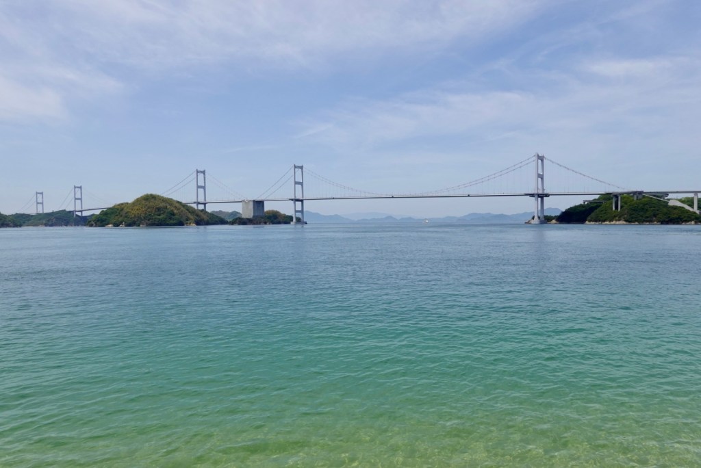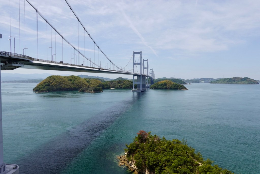 Heading from the south, the first bridge is the most impressive. The Kurushima-Kaiyo bridge, which is 4 km long, opened in 1999. the worlds first three continuous suspension bridge. It crosses Kunshima Strait.