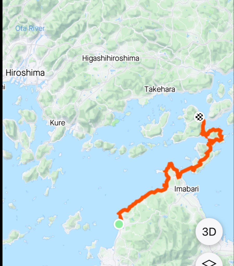 We predominantly followed the coastline today. The body of water on the map is the Seto Inland Sea, and it separates three of Japan’s main islands (Honshu, Shikoku and Kyushi). It serves as a waterway connecting the Pacific Ocean to the Sea of Japan, and contains over 3,000 islands.