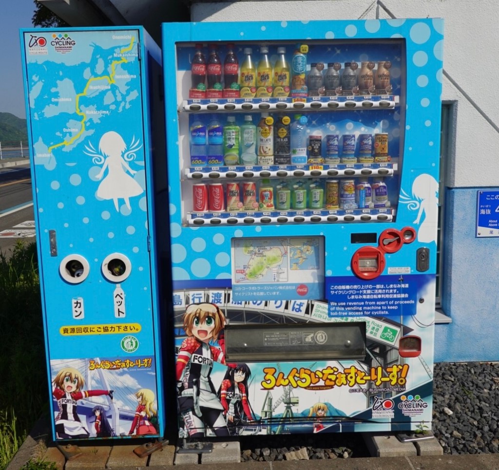 Whilst I waited for Tony at out first pit stop, I took a better look at this vending machine. Stunned female cyclist, but on the front, information that the proceeds help to prevent cyclists paying a toll to use the bridges.