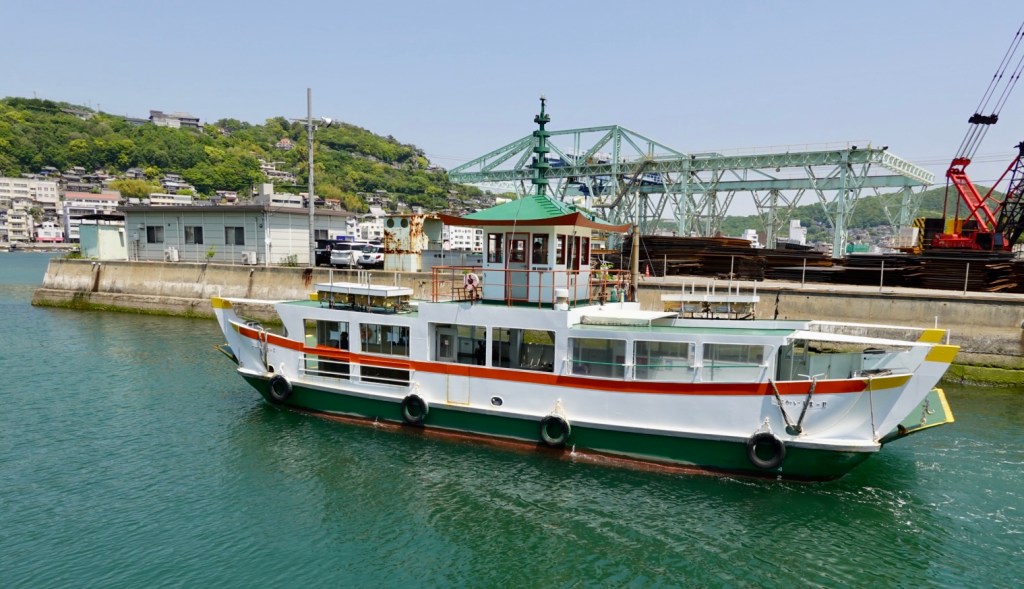 Ominichi, to cross or not to cross? There were multiple ferry options but we decided this was close enough. There is a cable car going up to a viewing platform in this image.