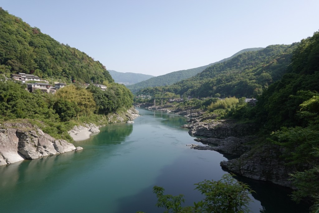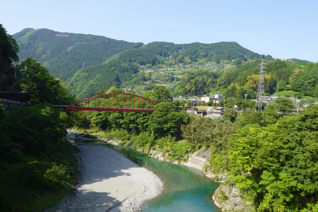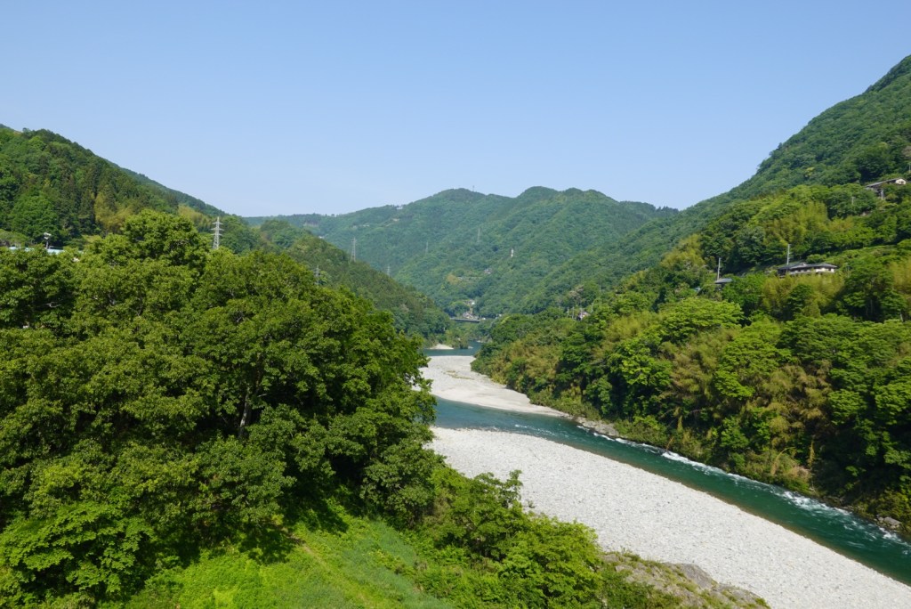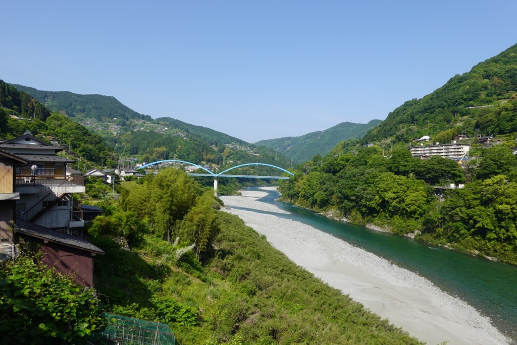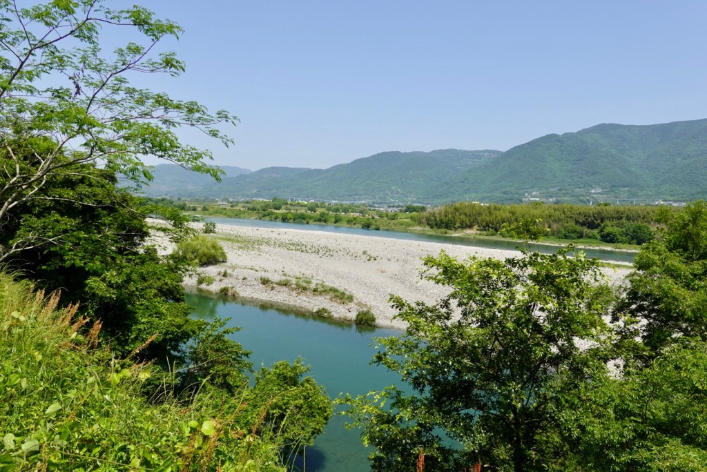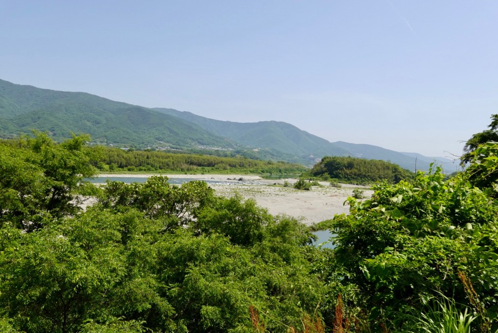 Crossing another bridge, this is the view as we looked towards Tokushima down the valley. The gap between the hills is ocean. the Yoshino River empties into the ocean there.