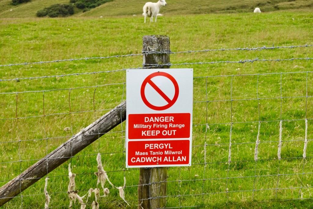 Adjacent was a military firing range. The red flags were flying, the sheep oblivious. These sheep are fenced, but there were many others wandering around the roadside.