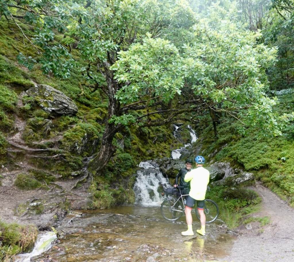 In between dams we were passed by these two cyclists. We did laugh at how keen one was for this photo, standing in the water with his bike.