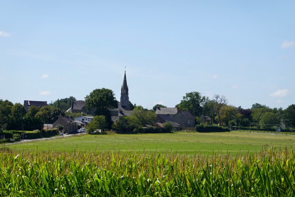 This photo is a typical view of a French village. Cornfields, church spire, hill, few houses.