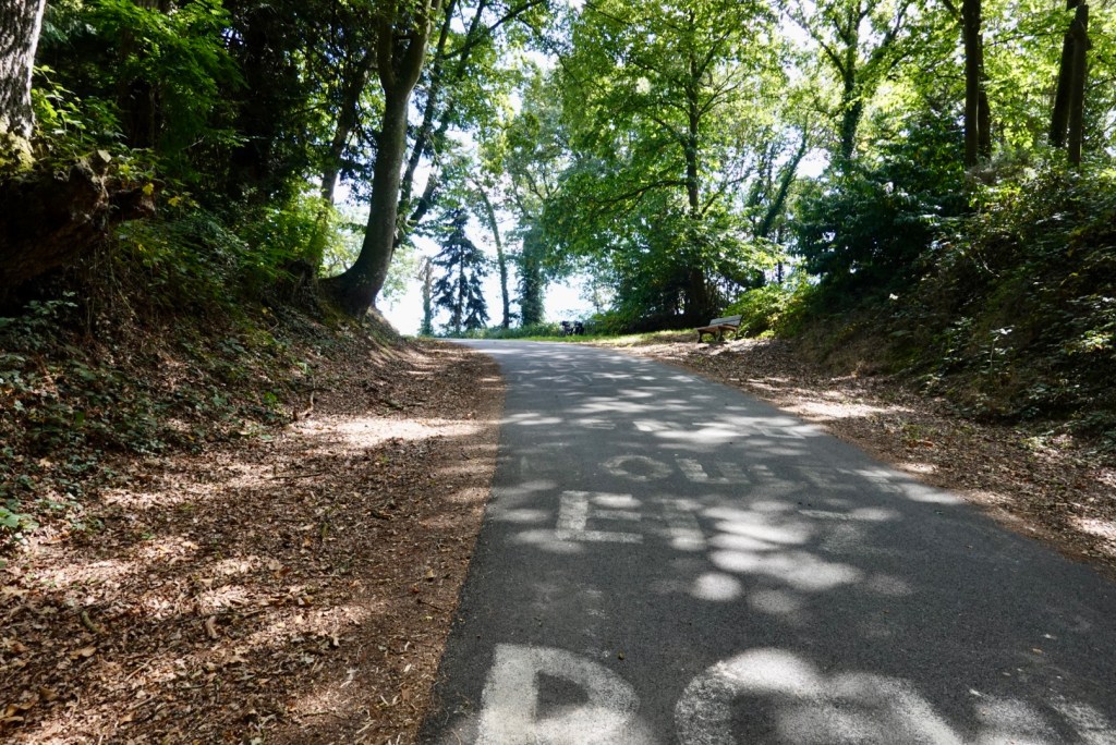 We had to climb to leave town, which is always a joy with legs that have cooled down and past this sign for a former chateau that looked quite magnificent in its day.