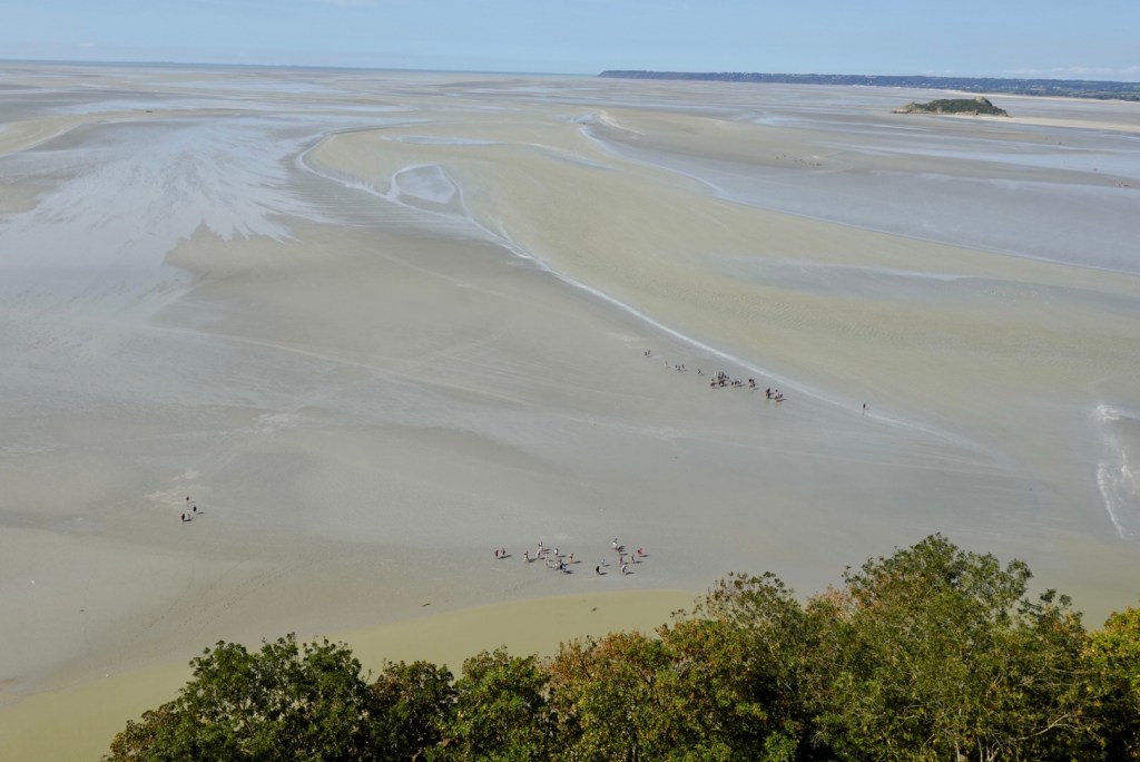 The view from the top across the bay was astounding. Right to the cape the tide is out. There are multiple groups walking across the sand including one nearer the little island. It would be interesting to watch the tide coming in.