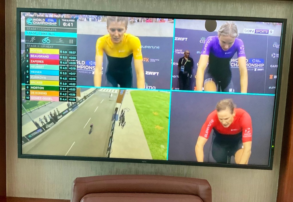 On a nearby TV there appears to be a Zwift esport competition on.