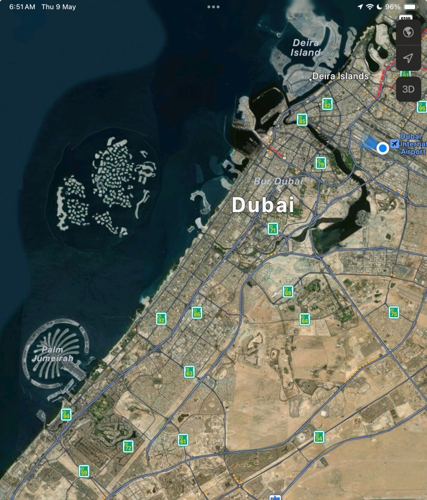 This map is interesting, with the blue dot showing our location at the airport. Offshore are the manmade islands created by the UAE.