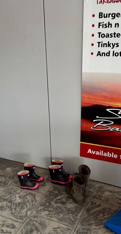 Dinner was at the local pub. This is where you leave your gumboots arriving at the pub on a fine, no rain day. Another curiosity in New Zealand. I guess they wandering around in bare feet now.