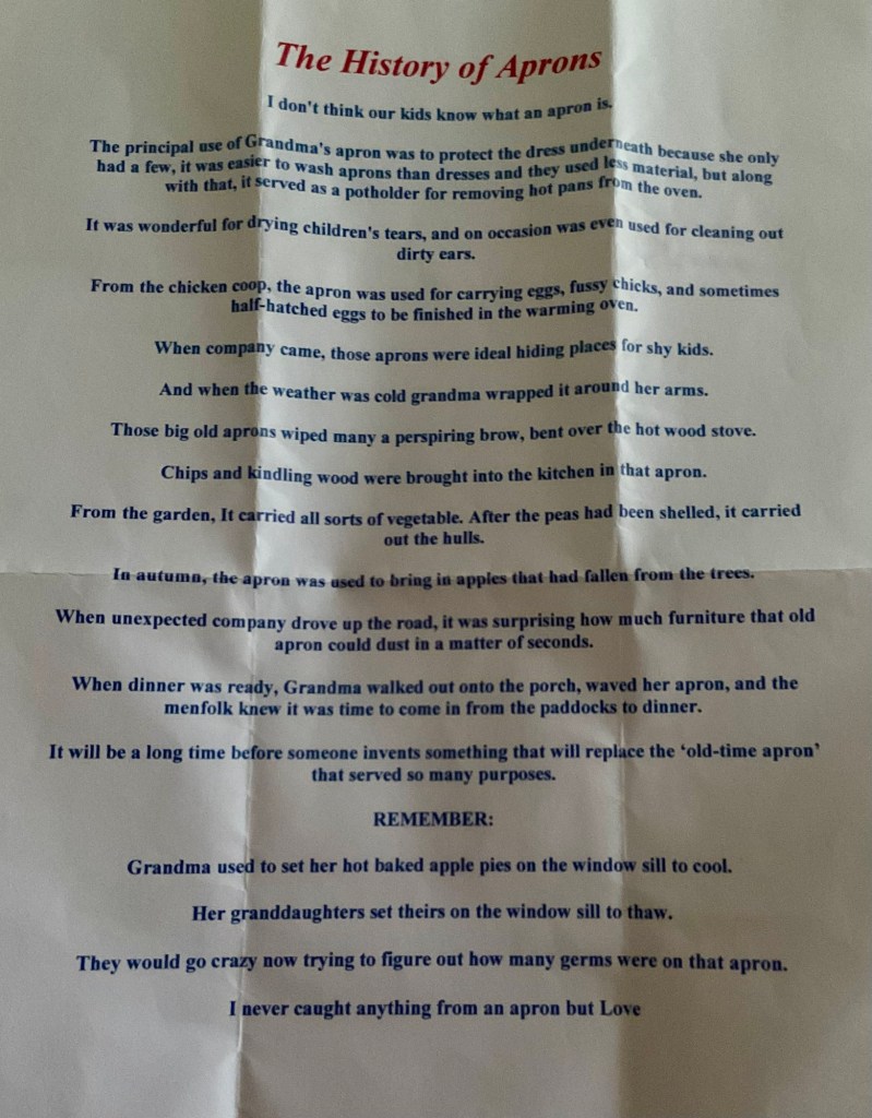 The Apron story had me reminiscing about my Grandmother and Great Grandmother (who I have the good fortune to remember) both of who were apron wearers, loved it 🥰