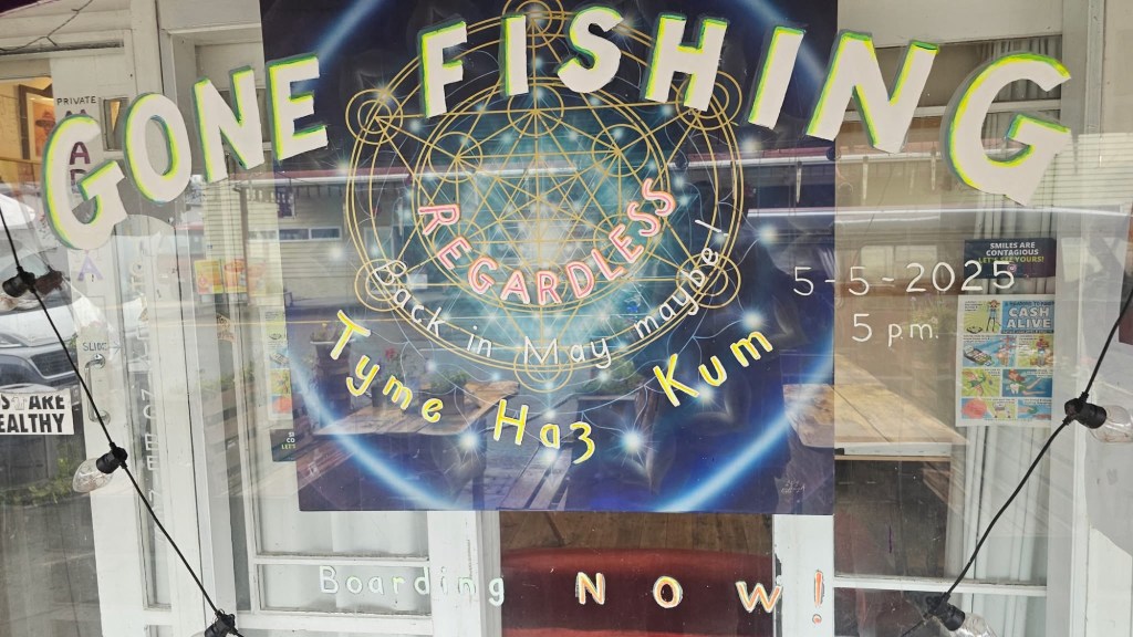 The other cafe? This art work sign appeared on the window the previous day. Doors were shut so I had peered at the art work through the windows. However, as we headed back to shower guess who was standing out the front? NgAngA himself. Fish can’t be biting!