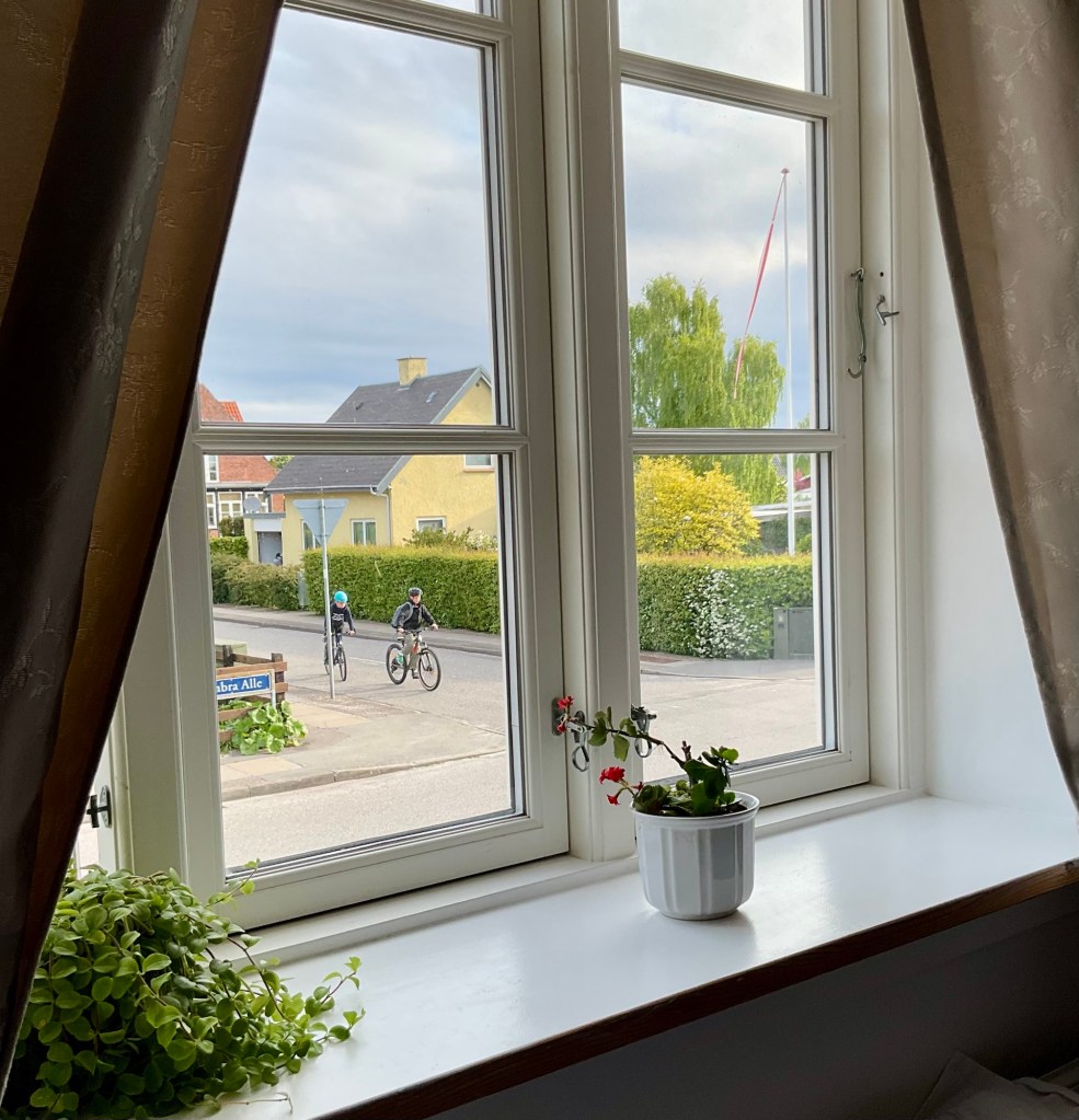 That is the view out our bedroom window. Danish flags and cyclists. So many locals cycle past here. Great sign.