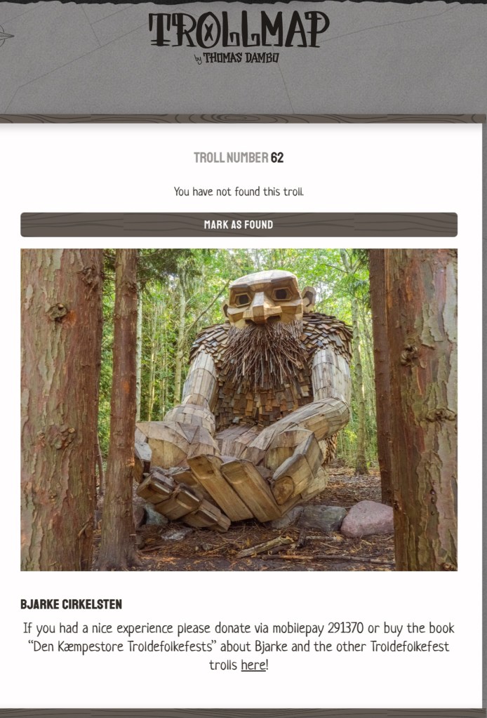 Thomas Dambo has a Trollmap website where you can register and tick off trolls found. We did find this troll, I’m just not registering 😁