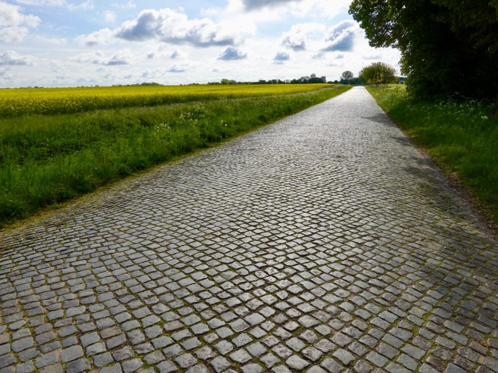 As we turned slightly inland on the designated cycle route, adjacent to a busy arterial road we started what would be around 20 km of cobbles. At the start we had no idea it went so far as our maps showed a sealed surface, not what type.