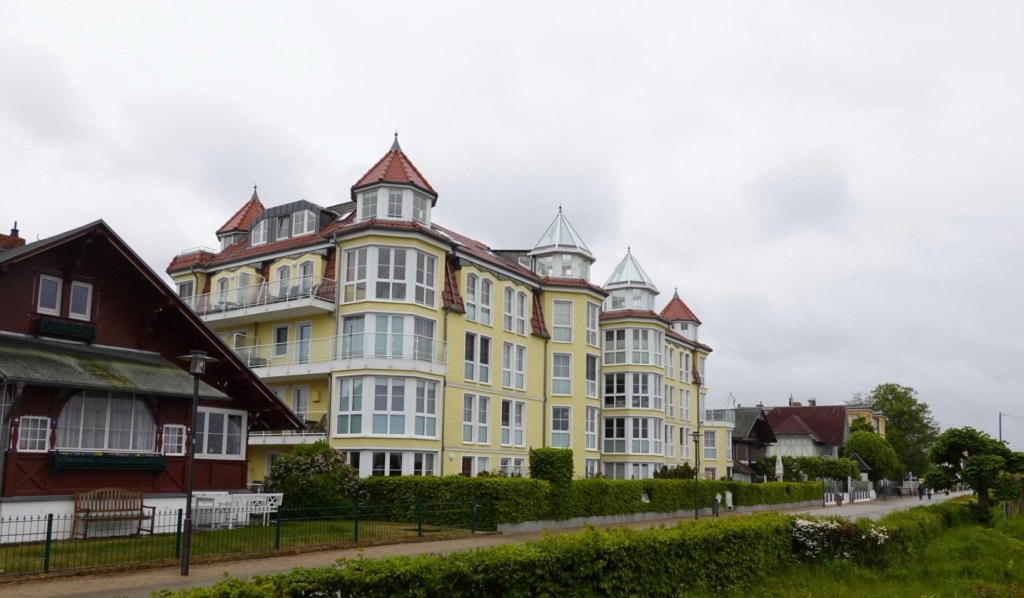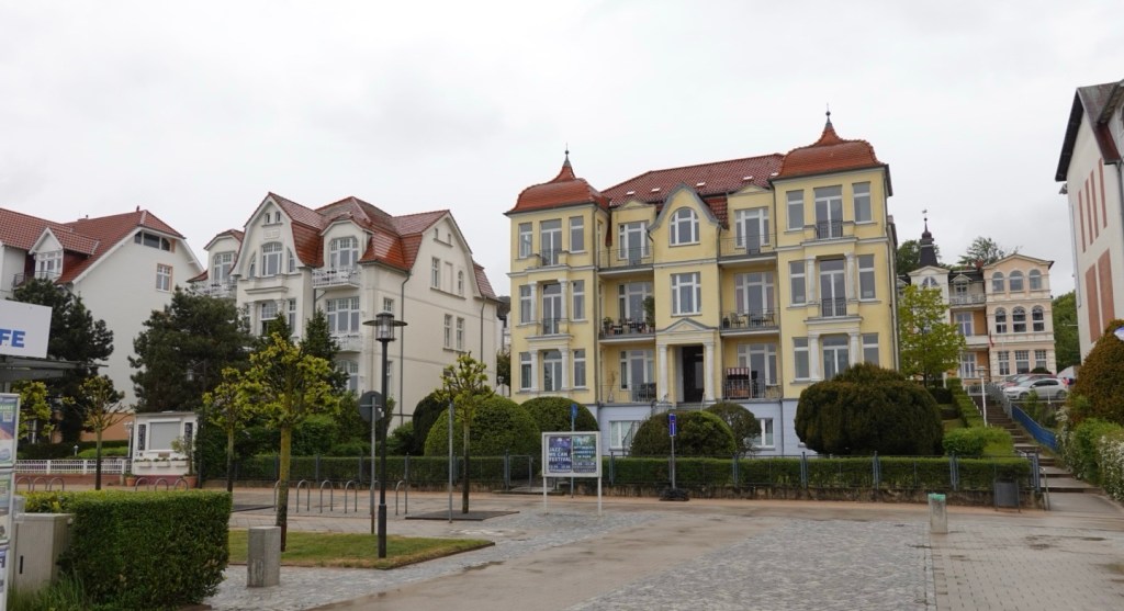Huge villas in the tourist haven of Ahlbeck.. In this area we were riding along a paved, wide boulevard adorned with places to buy food such as crepes, ice creams or beer. We could imagine that when the 1906 sunshine hours are in action, the place would be packed.