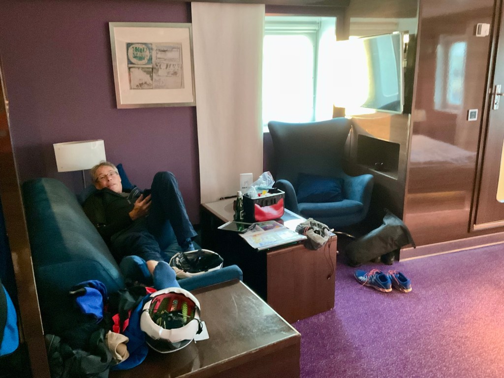 A few hours later we were amongst the first to board. Our bikes were wheeled on with us as they are carbon. Non carbon bikes are stacked onto a trailer that goes I to the vehicle hold, but special treatment for carbon.