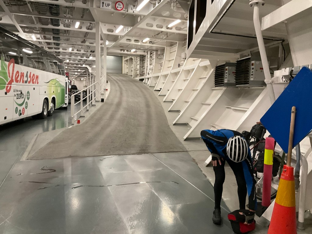 We were the very first to enter the cargo hold, cycling to the far end and strapping our bikes to the side. The motorbikes and then buses followed.