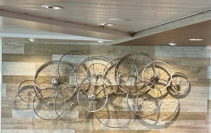So up we went, in our cycling gear, and here we sat for the duration, enjoying the views in a restaurant with only three other guests! Nice meal too!