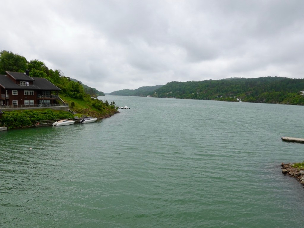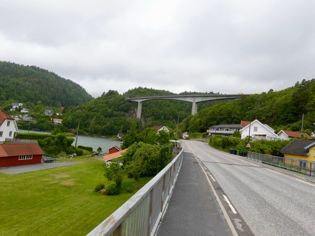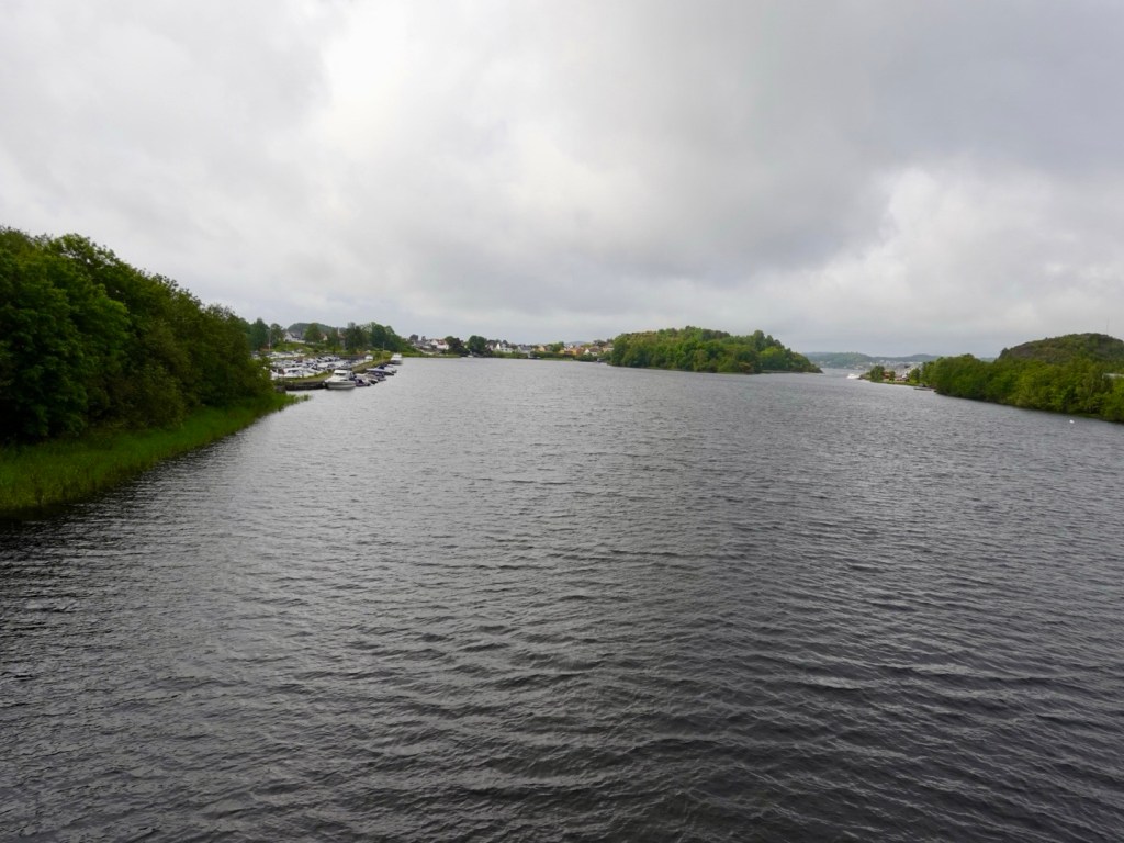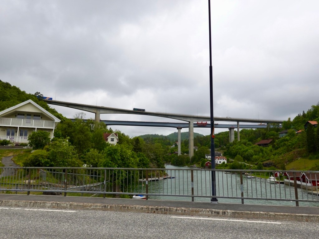 Closing in on our destination, water to our left, we head towards the large bridge connecting Brevik and Stathelle.