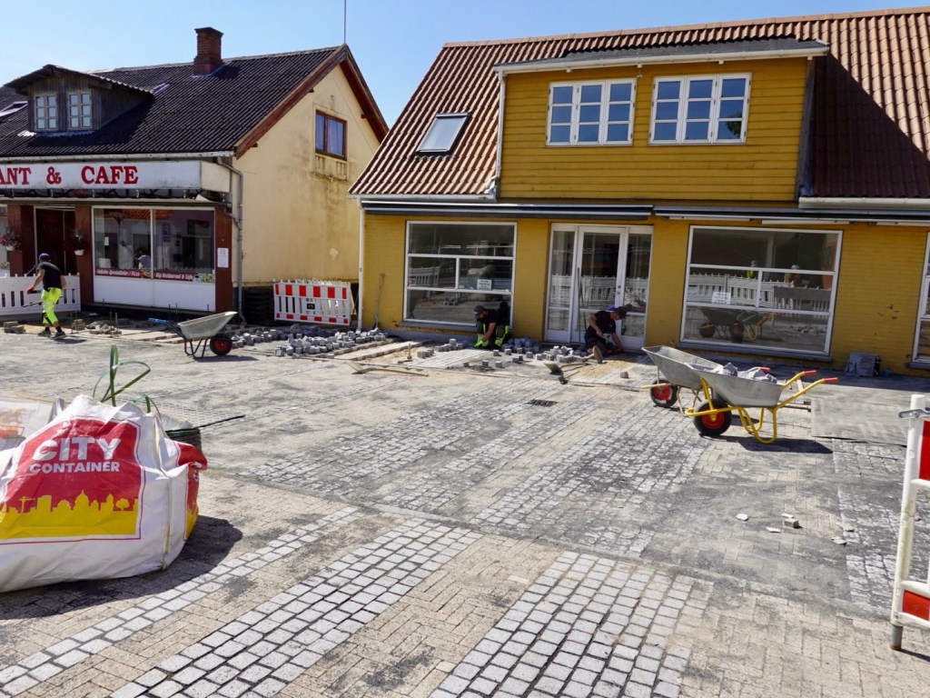 A road blockage in this town to install modern cobbles.