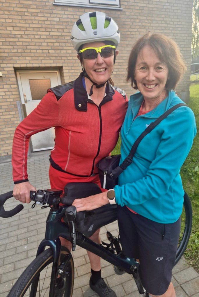 Deb and I. Tony and I cycled to their accomodation. I was hybrid in my clothing, wearing a dress, cycle jacket to keep warm and I slipped riding knicks on under the dress. Here we are just heading home at about 9.15 pm. You can seen how light it still is!
